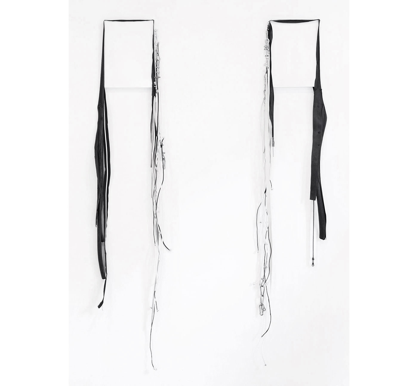 2017, PVC, artificial leather, rubber tube, wiring cords, zipper, bolts and wood frame, 30 x 160 cm each